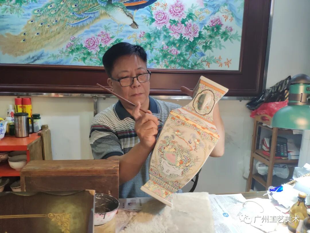 刘铭雄大师,广州市工艺美术大师,广东省工艺美术师,高级技师,广州市突出贡献技术能手。刘大师自20世纪70年代开始涉足陶艺术领域,师从广彩四代传人司徒胜祥、中国工艺美术大师赵国垣等学艺;集各家之长,潜心研究和传承,把广州彩瓷传统技艺与中国绘画理论和基础融为一体。从艺四十多年功力深厚,良好的艺术基础,图案结构饱满,彩绘精细,擅长描绘人物、花鸟、山水、釉下彩青花等。形态各异,栩栩如生,作品屡获国家、省、市奖项,深受行业内外专家赞赏和青睐,部分作品收藏于各大博物馆。刘大师在广彩行业从业经验丰富,历经工厂学徒、技术工人、下海创业、进校园教学等多领域多层面的艺术生涯。